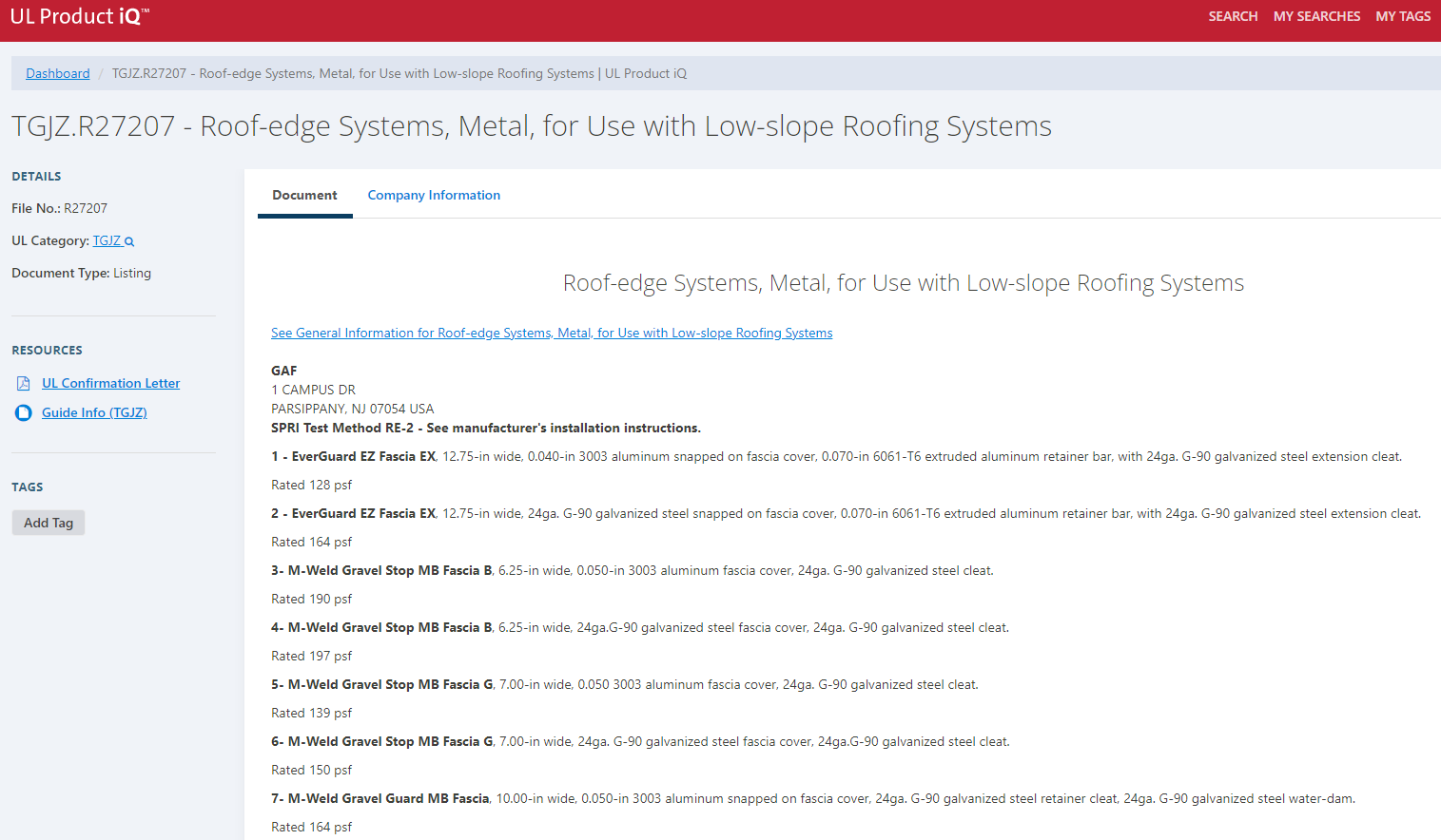 Knowing UL's Category Control Number is key to navigating UL's Product IQ. . For metal edges and coping, UL's Category Control Number is "TGJZ". After logging in, performing a search using "TGJZ" provides a list of the manufacturers that have Approval Listings with UL. Clicking on GAF's Approval Listings allows users to easy find rated Roof-edge Systems, Metal, for Use with Low-slope Roofing Systems.