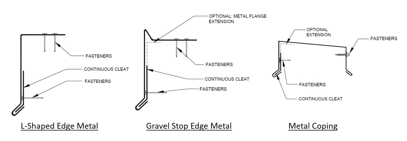 The term 'edge metal' encompasses three foundational shapes that are used at a roof's perimeter: L-shaped metal, gravel stop metal, and copings for parapets. The figures below show generic shapes; ones that are often contractor-fabricated. Additionally, there are many manufacturers that provide edge metal. Some of the manufacturer-fabricated shapes are similar to those shown below. However, some are a bit more distinct and some are extruded to achieve more unique shapes.