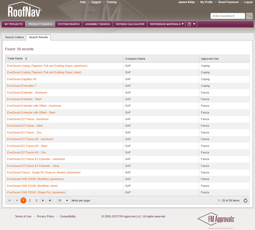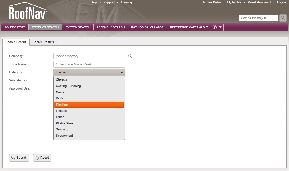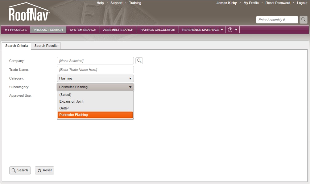 Within RoofNav, Approval Listings for metal edges and copings can be found under "Product Search" using the "Flashing" category. Most likely, users of RoofNav are familiar with the "Assembly Search" function which is regularly used to locate roof systems based on their wind-uplift ratings.