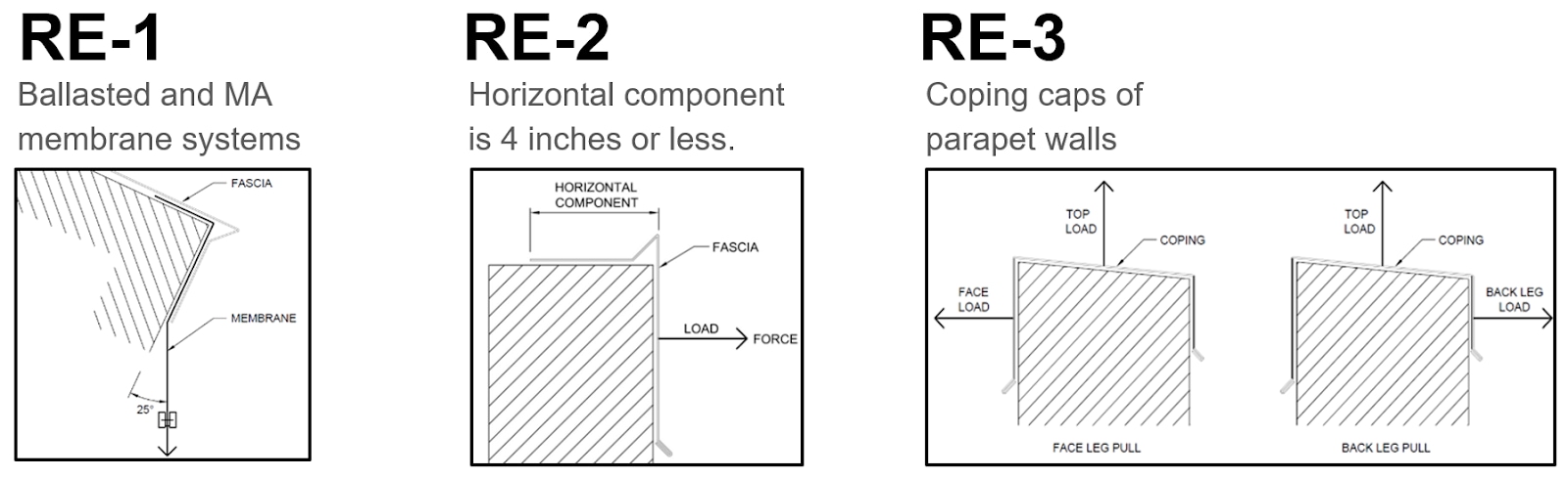 The RE-3 test method is for copings, and RE-3 includes two tests. One test includes an upward load and a 'face' load; the second test includes an upward load and the 'back leg' load.