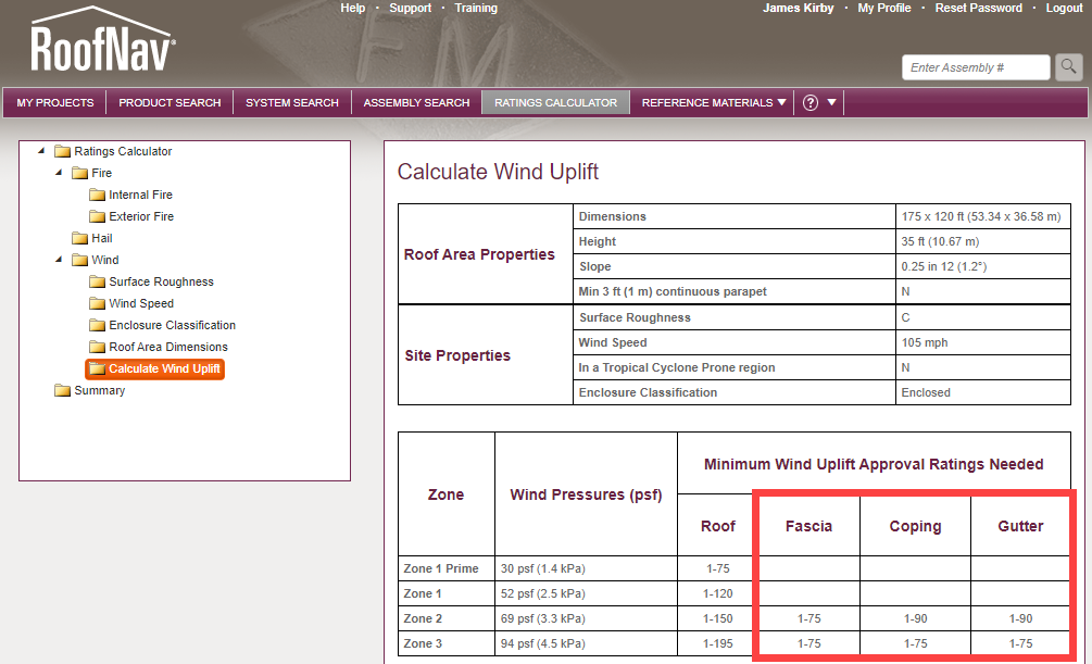 FM announced on its website on October 28, 2021 that "The Wind Ratings Calculator has been updated to return separate flashing ratings for roofs." The red-highlighted area shows the required capacity for Fascia, Coping, and Gutter products.