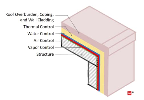 To better understand common parapet challenges, it is important to review continuity across the roof and wall systems, specifically the key four Control Layers: Water, Air, Thermal, and Vapor. These four key Control Layers should generally be continuous across all six sides of building enclosures. It is difficult–but not impossible–to achieve effective Control Layer continuity across building systems, especially at significant transitions like a parapet, where the roof system meets the wall system.