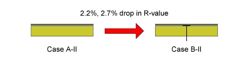 When the HD ISO was added (Cases II), R-value fell by 2.2% and 2.7% for the physical experiment and computer simulation, respectively, when the fastener was added. In other words, adding the fastener still caused a drop in R-value, but that drop was considerably less than when no cover board was used. This proved what we suspected, that the HD ISO had an important protective effect against the thermal bridging caused by the fastener.