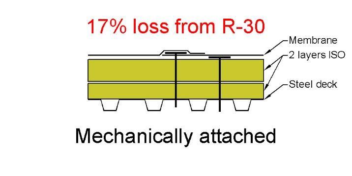 They assumed a 15,000-square-foot roof, fastener patterns and densities based on a wind uplift requirement of 120 pounds per square foot, and a design R-value of R-30. In this example, a traditional mechanically attached roof had an in-service R-value of only R-25, which is a 17% loss compared to the design R-value.