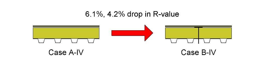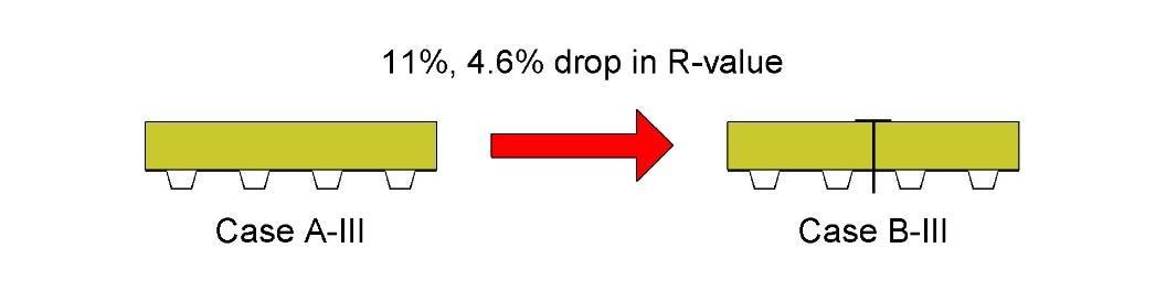 First, it's no surprise that the fastener reduced the R-value of the 2' x 2' sample of ISO alone by 4.2% in the physical sample, and 3.4% in the computer simulation (Case B-I compared to Case A-I).