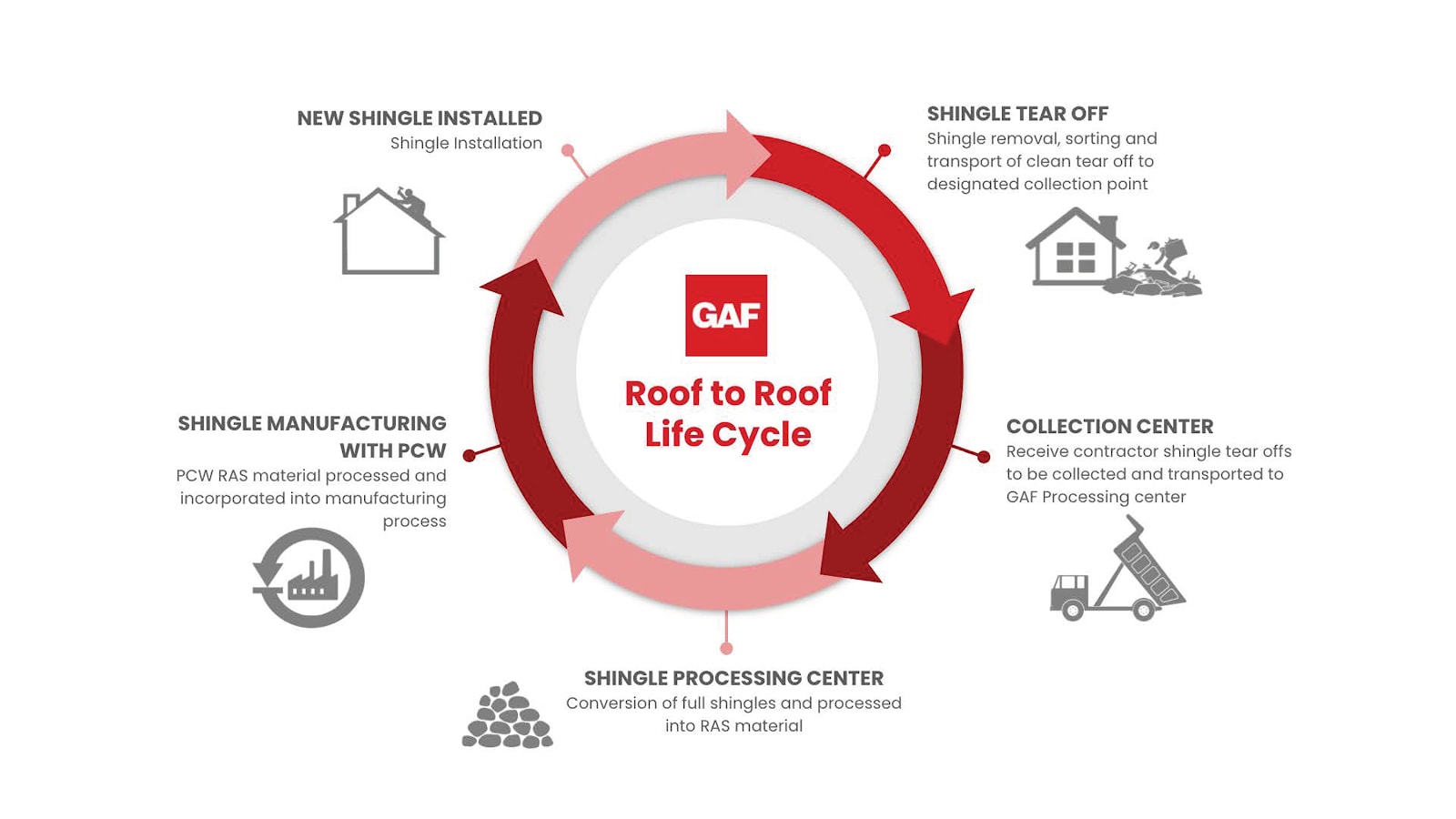 As leaders in the roofing marketplace, GAF recognized a responsibility to address this asphalt waste challenge. So this month, the company announced a breakthrough shingle recycling process that has produced the industry's first asphalt roofing shingles to contain RAS (recycled asphalt shingles) from material that may have otherwise been sent to a landfill.