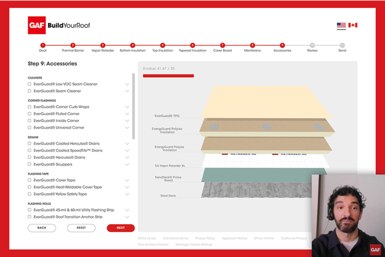 The tool currently supports GAF TPO and PVC single-ply products, coatings, flat and tapered insulation, coverboards, thermal barriers, vapor retarders, details and accessories including drains, corner flashings, cleaners, primers, sealants, flashing tape, flashing rolls, vents, and more.