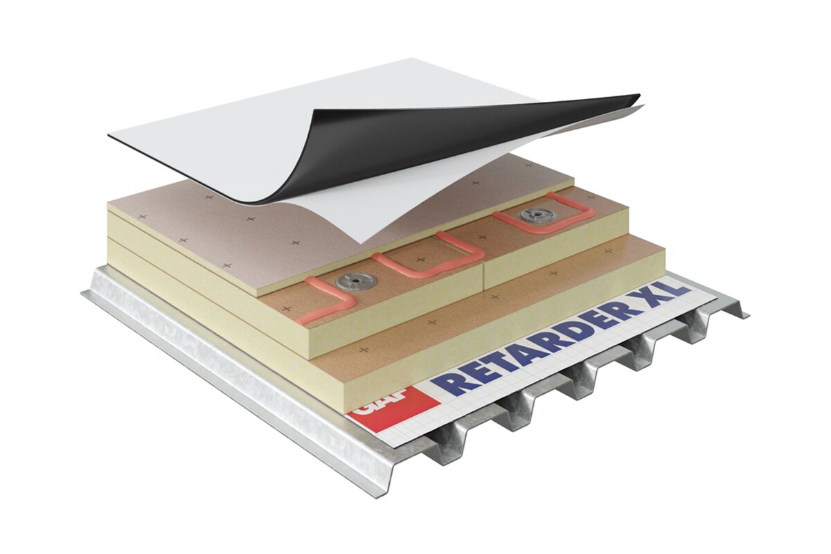 Finally, beneath two layers of EnergyGuard™ Polyiso Insulation, GAF SA Vapor Retarder XL was applied directly to the metal deck. "The SA Vapor Retarder XL is a game-changer for roofing projects,” said John Cain, founder of JC Roofing and Insulating. “Its impressive thickness and tackiness provides superior sealing around penetrations like screw holes, while its user-friendly application process—just peel, stick, roll — offers substantial labor savings.”