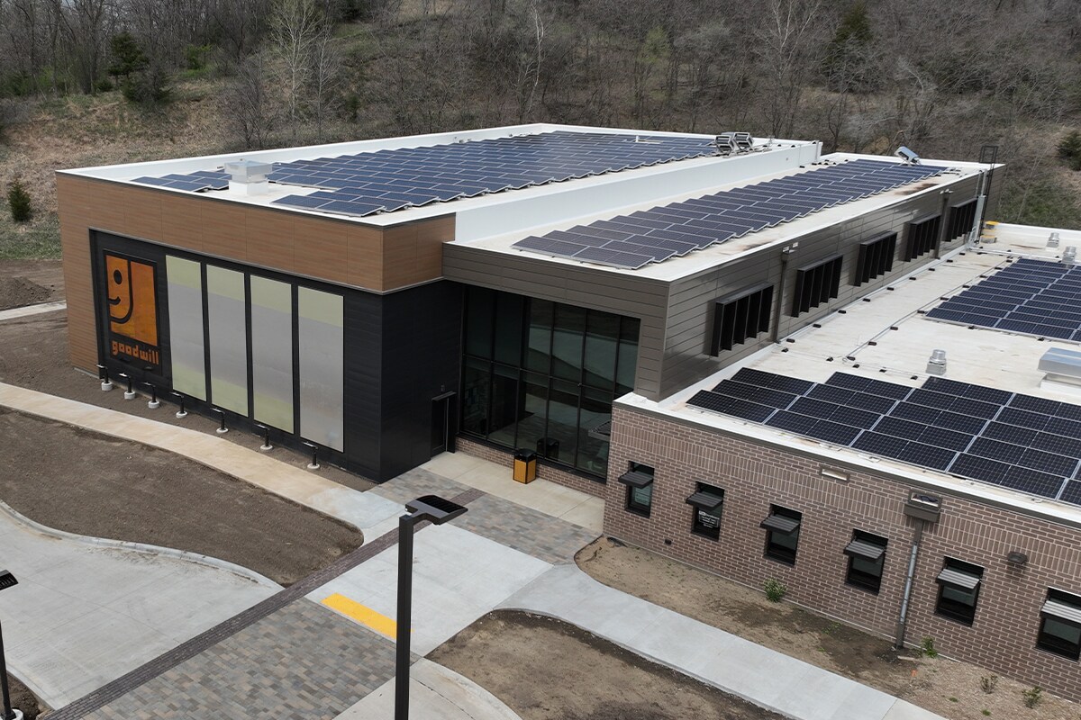 Net-Zero goal — The building’s project partners were determined to honor the Goodwill of the Great Plains organization’s deep commitment to sustainability, and set out to create a net-zero energy building*. Among the decisions supporting the goal, the design team integrated solar panels throughout the building, which will allow it to produce as much energy as it consumes annually. The building also uses a geothermal system with over 60 wells. Reflective features incorporated into the building design — such as white reflective TPO on the roof — will help minimize heat absorption as the TPO reflects solar energy away from the building, helping to lower the building’s overall energy consumption and cooling costs.