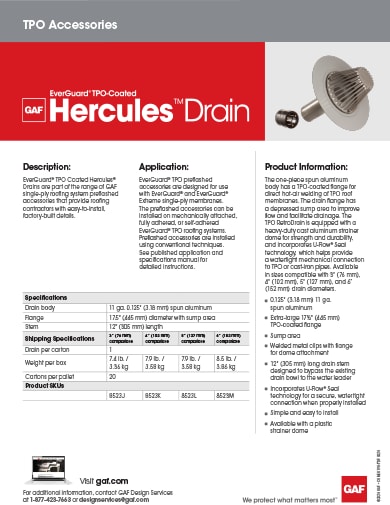 One-piece seamless body manufactured from 0.125" 11-gauge spun aluminum used for depressed sump area for improved flow and to facilitate drainage. Incorporates U-Flow® Seal technology, a trademark of OMG Roofing Products, providing a mechanical watertight connection to PVC or cast iron pipes. TPO-coated flange for direct hot-air welding of TPO roof membranes.