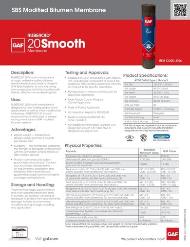 RUBEROID® 20 Smooth is a tough, resilient modified bitumen membrane manufactured to stringent GAF specifications. Its core is a strong, resilient non-woven glass mat that is coated with flexible, SBS polymer-modified asphalt. RUBEROID® 20 Smooth is backed by GAF, a company with over 130 years in the roofing business.