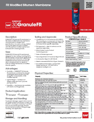 RUBEROID® 30 Granule FR Membrane is a fire-resistant modified bitumen membrane manufactured to stringent GAF specifications.