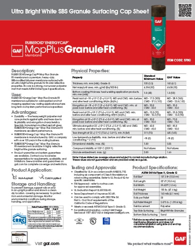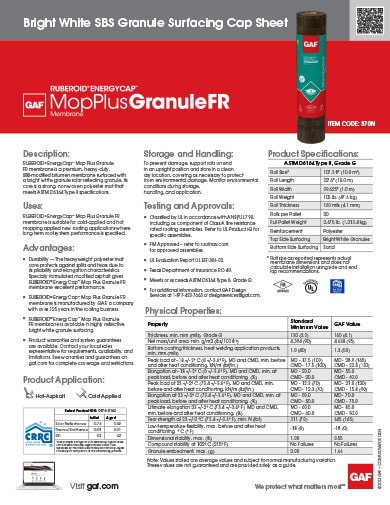 RUBEROID® EnergyCap™ MOP Plus Granule FR is a premium, heavy-duty, fire-resistant modified bitumen membrane with a bright white granule surfacing.