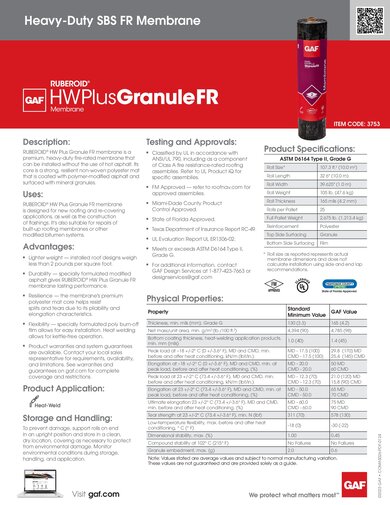 RUBEROID® HW Plus Granule FR Membrane is a premium, heavy-duty fire-retarding membrane that can be installed without the use of hot asphalt. Its core is a strong, resilient non-woven polyester mat that is coated with an inherently fire-retardant polymer modified asphalt and surfaced with mineral granules.