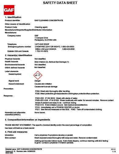 GAF Cleaning Concentrate Cleaner is non-toxic and leaves no pollutants or contaminating by-products to damage the environment. It has excellent cleaning capabilities with most types of coatings including acrylic, polyurethane, silicone and Hypalon®. Because it is 100% biodegradable, it can be washed off the surface without any harmful effects to the environment or ground vegetation. It penetrates the old coating, lifting the oxidized material, dirt, grease, and other contaminants into suspension for easy flushing from the substrate, leaving behind an acceptable surface for re-coating (formerly known as United Coatings™ United Cleaning Concentrate (UCC)).