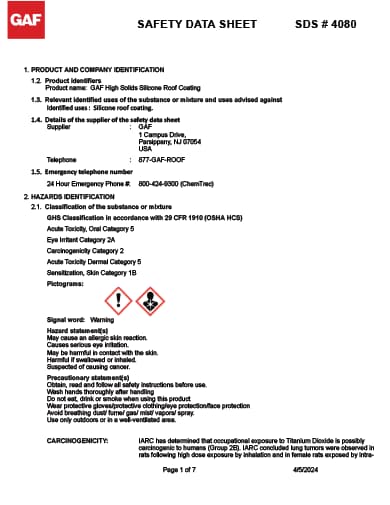 GAF High Solids Silicone Roof Coating is a high-solids, moisture-cure silicone roof coating that provides protection against weather elements, UV rays, and leaks due to ponding water for a variety of substrates.