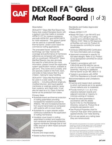 DEXcell FA™ Glass Mat Roof Board protects and supports the roof membrane; provides increased fire, moisture and mold resistance; and reduces the potential for penetration damage to the membrane. DEXcell FA™ Glass Mat features a precoated facer surface technology which help to improve the coverage and performance of membrane adhesives as compared with systems with no cover board.