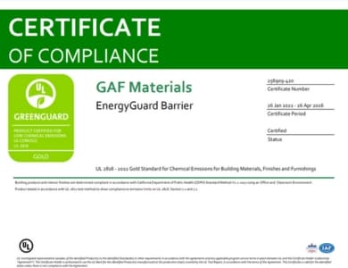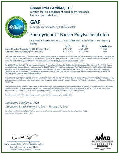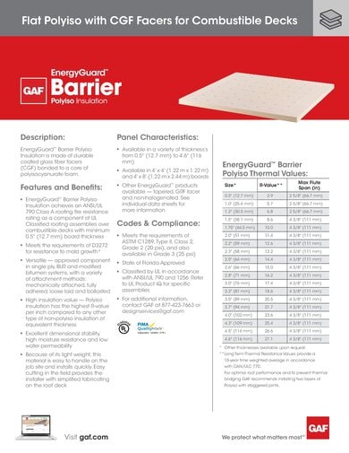 EnergyGuard™ Barrier Polyiso Insulation is made of coated glass-fiber bonded to a core of isocyanurate foam and achieves an ANSI UL790 roof rating over combustible wood decks with a ½" board thickness.