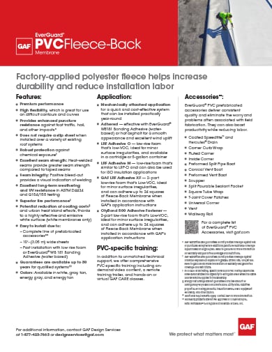 EverGuard® PVC Fleece‑Back Membrane delivers built-in trust. Made from a popular and time-tested construction material, it provides strong protection against UV exposure, weather elements and chemicals.* EverGuard® PVC Fleece‑Back Membrane also provides enhanced protection against hail and punctures.** It is highly flexible, weldable and repairable, making it an excellent choice for most low-slope roof systems.