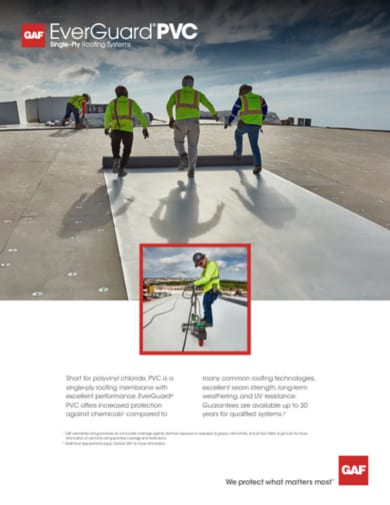 EverGuard® PVC Membrane delivers built-in trust. Made from a popular and time-tested construction material, EverGuard® PVC Membrane provides strong protection against UV exposure, weather elements and chemicals.* It is highly flexible, weldable and repairable, making it an excellent choice for most low-slope roof systems.