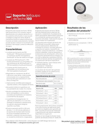 GAF Rooftop Equipment Mount 100 helps provide a secure connection directly to the roof deck or structural decks, redirecting the wind load off of the membrane and onto the structural deck. When properly installed, it can help to reduce rack or equipment movement and prevent water infiltration. GAF Rooftop Equipment Mount 100 is designed for uplift and shear retention on a commercial roof.