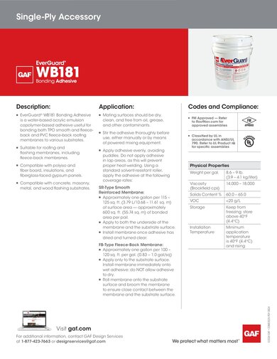 EverGuard® WB 181 Bonding Adhesive is compatible with concrete, masonry, metal, and wood flashing substrates. When installing with fleece-back TPO or PVC, EverGuard® WB 181 Bonding Adhesive has an up to 50% faster installation time than traditional smooth, fully-adhered systems. Its low VOC content with little-to-no odor reduces the disruption to building occupants.