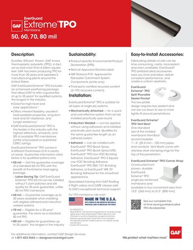 GAF EverGuard Extreme® TPO is ideal for applications (including high-heat and solar applications) where you want the very best long term performance you can get.* Our TPO membranes offer inherent flexibility, excellent heat-sealable properties, long-term heat and UV resistance, fungal resistance,** and high reflectivity (white only). The construction of our TPO membrane has remained unchanged for more than 20 years, selling more than 6 billion square feet. We operate manufacturing plants across the United States, and we offer 10- and 12-foot rolls and a variety of thicknesses.