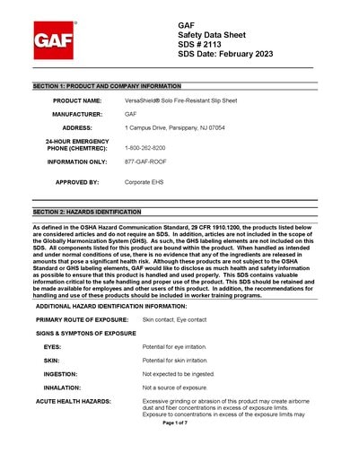 Versashield® SOLO™ Fire Resistant Slip Sheet SDS - 2113