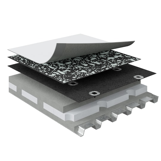 - Membrana lisa RUBEROID® 20 (hoja base asfáltica con superficie superior de arena) que se aplica en el adhesivo para membrana de SBS prémium MATRIX™ 102
