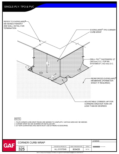 Las cubiertas para bordillo esquineras de PVC EverGuard™ ofrecen a los contratistas un detalle de fábrica fácil de instalar. Las cubiertas para bordillo esquineras de PVC EverGuard™ se fabrican con membrana de PVC de etileno-éter-cetona (KEE) reforzada de 50 milésimas de pulgada y están diseñadas para el uso con membranas para techado de PVC, PVC XK y PVC KEE EverGuard
