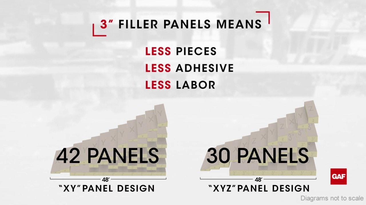 - El diseño de panel extendido utiliza hasta un 30 % menos de poliisocianurato aplicado, lo que se traduce en un 30 % menos de material manipulado y un 30 % menos de adhesivo; esto equivale a menos trabajo para ti.
